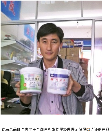 記者隨意走進10棟的一家食用化工商行。該商行的進門處,放著多箱標注產地為青島的“肉寶王”。記者從貨架上拿起一桶正要查看,老板蔡先生循聲從里面走出來,警惕地問:“你是做什么的?”記者表明了身份,表示希望坦誠交流,蔡先生這才放松緊張情緒!澳悴粫缘,這兩天來我店子里暗訪的記者不止一位,所以我一看你走進來,就猜你可能也是記者!辈滔壬f。