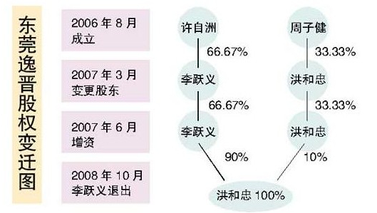 那么李躍義又是何時介入到東莞逸晉的呢?據(jù)東莞逸晉的公司決議,在2007年3月的一次股東會上,許自洲、周子健以原出資金額將手上的全部股權分別轉(zhuǎn)給了李躍義和洪和忠。轉(zhuǎn)讓后,李躍義獲得了許自洲手上的66.67%股權。隨即,公司章程也進行了修改,李躍義擔任了公司唯一一名執(zhí)行董事、經(jīng)理和法定代表人。
