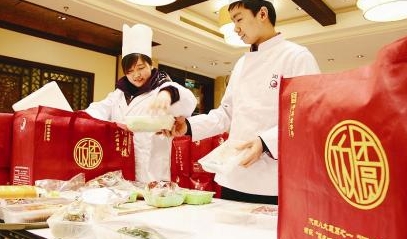 近日,蘇州某飯店服務(wù)員為“打包年夜飯”配菜。春節(jié)將至,蘇州一些“老字號”餐飲單位推出品種豐富的半成品“打包年夜飯”,讓市民在家中就能吃到美味可口的年夜飯。這樣既節(jié)儉又方便,受到消費者青睞,銷售十分火爆。