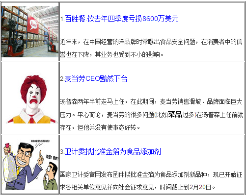 洋快餐不僅在中國的市場遭受挫折,在美國本土也因為種種問題導致銷售滑坡,百勝集團公布第四季度財報虧損巨大,麥當勞CEO黯然下臺。春節(jié)近了,衛(wèi)計委擬批準金箔為食品添加劑,因為熱議。外賣平臺受到資本市場青睞,繼美團獲得7億美元融資后,外賣O2O平臺“餓了么”上周也宣布獲得3.5億美元巨額融資。一起來關注本周餐飲熱點: