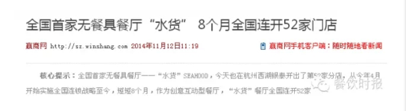 2013年9月開張至今的水貨,成為了中國(guó)餐飲轉(zhuǎn)型的催化劑:超炫的海底世界,無餐具徒手體驗(yàn)、時(shí)尚潮流的視覺沖擊再加上一系列創(chuàng)新的產(chǎn)品和口味,使其在一年多的時(shí)間完成加盟近100家,11月全國(guó)落地開張52家,單店投資均不低于180萬,加盟費(fèi)50-120萬不等,一年時(shí)間實(shí)現(xiàn)品牌盈利約近億元,創(chuàng)造餐飲品牌連鎖的奇速。