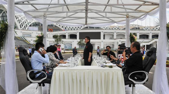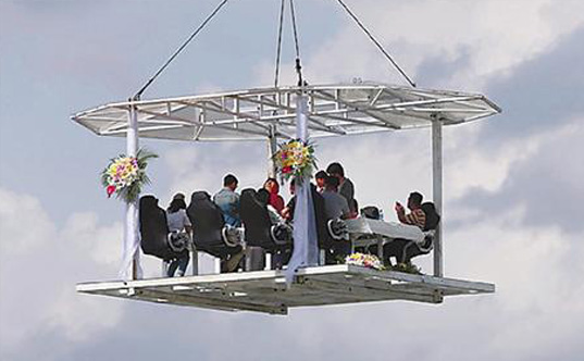 據(jù)聞,“空中餐廳”四周不設(shè)圍欄,享受餐飲服務(wù)的價格為每位8888元。看到“空中餐廳”被起重機(jī)吊著緩緩升空,不少圍觀市民嘖嘖稱奇,紛紛舉起相機(jī)、手機(jī)拍照留念,并感嘆:“這是用生命在吃飯呀!”、“這吃的不是飯,而是刺激體驗!”。