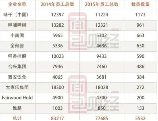 面包財經(jīng)翻查了港股與A股餐飲類上市公司財報發(fā)現(xiàn),大部分餐飲公司在2015年均采取了較為明顯的裁員措施。下圖為面包財經(jīng)整理的在A股和港股上市餐飲企業(yè)員工數(shù)變化圖:上述10家餐飲企業(yè)裁員人數(shù)為5532人,裁員率為6%;其中味千員工數(shù)量減少最多,較上年減少1173名;全聚德員工減少比例則高達12%。