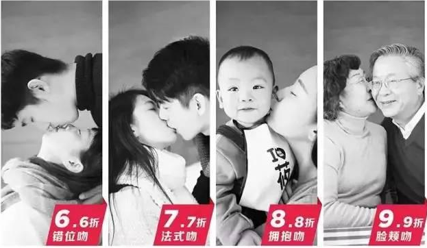 “西貝”為“親嘴打折節(jié)”準(zhǔn)備了一個(gè)極其吸引眼球的廣告語“吻得越深,折扣越大”,并設(shè)計(jì)了四種不同的親吻姿勢和對應(yīng)折扣。別出心裁的打折方式,給了中國人一次公開高調(diào)秀恩愛的機(jī)會!